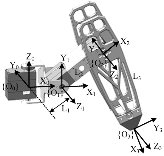 By applying Equation (2), the transformation matrix expression for the endpoint coordinate system {O3} relative to the base joint coordinate system {O0} can be derived.