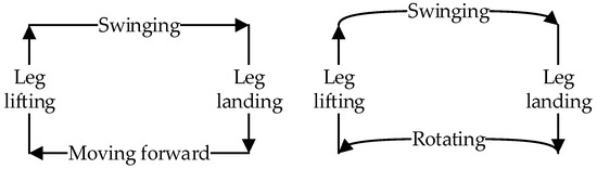 - Moving state: The support group moves from the starting position to the endpoint. This movement propels the entire robot forward, as the foot-ends of the support group remain stationary relative to the ground. Depending on the movement mode, this state can be further categorized into a forward and omnidirectional gait, rotational gait, and compound gait.