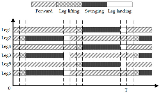 Hexapod robots utilize a variety of insect-inspired gaits, primarily including tripod, quadrangular, and pentagonal gaits [32]. In the tripod gait, three legs can swing simultaneously, whereas in the quadrangular and pentagonal gaits, only two legs and one leg can swing at a time, respectively. Therefore, in the tripod gait, the load capacity of the hexapod robot is slightly lower than that under the other two gaits, but it achieves higher speed and greater walking efficiency. All gaits discussed in this paper are based on the tripod gait.