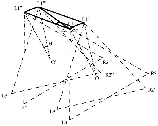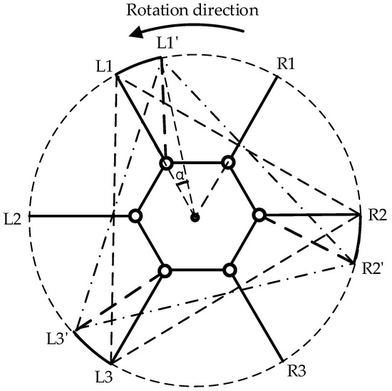 Displacement diagram of the support triangle in the rotational gait, where L1, L2, and L3 denote the endpoints of Leg1, Leg3, and Leg5, respectively, while R1, R2, and R3 represent the endpoints of Leg2, Leg4, and Leg6, respectively, and denotes the rotation angle of the hexapod robot. The support triangle for the hexapod robot before rotational motion is formed by L1, R2, and L3, while L1′, R2′, and L3′ represent the support triangle after the robot undergoes relative movement.