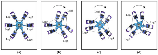 The rotational gait of the hexapod robot: (a) the robot’s initial state; (b) the robot’s status with G2 as the support group; (c) the robot’s status with G1 as the support group; (d) the robot’s status with G1 as the support group.