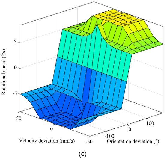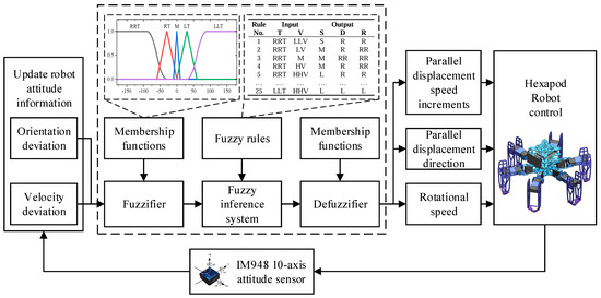 In summary, this study leverages orientation deviation and velocity deviation as key input variables, while output variables include the parallel displacement speed increments, parallel displacement direction, and rotational speed of the hexapod robot. This refined fuzzy inference strategy enhances the precision and agility of the robot’s movement, ensuring superior adaptability and performance in complex environments. The structure of the designed fuzzy controller is depicted in Figure 10.