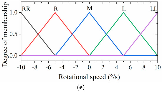 The fuzzy controller’s input and output variables are fuzzified as follows. For the input variables, the orientation deviation (denoted as T) spans a range of [−180°, 180°] and is categorized into five groups: large right turn (RRT), small right turn (RT), middle (M), small left turn (LT), and large left turn (LLT). Similarly, the velocity deviation (V) is defined within the range of [−50 mm/s, 50 mm/s] and is associated with five groups: large deceleration (LLV), small deceleration (LV), middle (M), small acceleration (HV), and large acceleration (HHV). For the output variables, the parallel displacement speed increment (S) ranges from −10 mm/s to 10 mm/s and is categorized into five groups: large deceleration (LL), small deceleration (L), middle (M), small acceleration (S), and large acceleration (SS). Moreover, the parallel displacement direction (D) is similarly defined within the range of [−180°, 180°] and fuzzified into five groups: large right shift (RR), small right shift (R), middle (M), small left shift (L), and large left shift (LL). Finally, the rotational speed of the hexapod robot (R), ranging from 30°/s to 30°/s, is fuzzified into five groups: fast right turn (RR), slow right turn (R), middle (M), slow left turn (L), and fast left turn (LL).