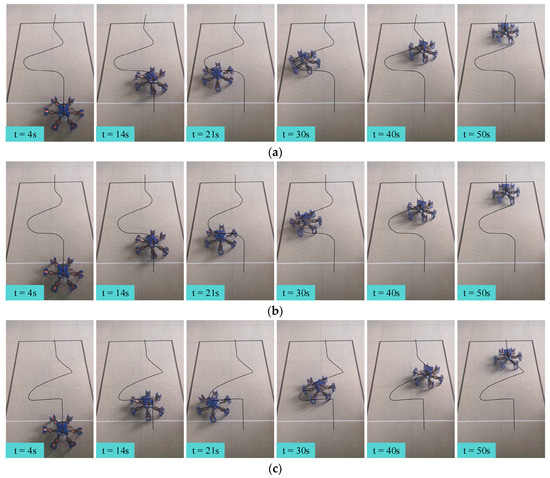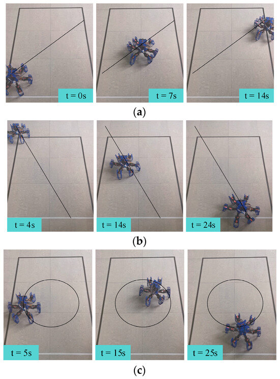 In order to validate the performance of the various proposed gaits, we conducted three sets of gait motion experiments. First, two omnidirectional movement experiments were carried out, maintaining the hexapod robot’s current orientation while setting the orientation deviation to 45° and 150°, respectively. The snapshots of these two gait experiments with time labels are depicted in Figure 15a,b. Finally, we performed the third experiment, where the hexapod robot executed a circular motion with a defined radius, as shown in Figure 15c.