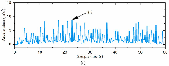 The acceleration curves of the robot: (a) the direct gait switching strategy, (b) the fuzzy-inference-based gait switching strategy, and (c) the combined omnidirectional and fuzzy-inference-based gait switching strategy. The acceleration is the absolute value of the inertial acceleration.