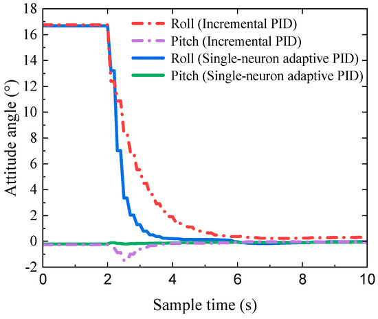 Figure 21 presents the attitude control curves during the experiments. It is clearly shown that the incremental PID control strategy took approximately 4 s to reach the desired attitude. In comparison, the single-neuron adaptive PID attitude control strategy achieved this in less than 2 s, reducing the attitude adjustment time by 50%. The experimental data reveal that the adaptive single-neuron attitude control strategy achieved faster adjustments to the predefined attitude, demonstrating superior performance in attitude control.