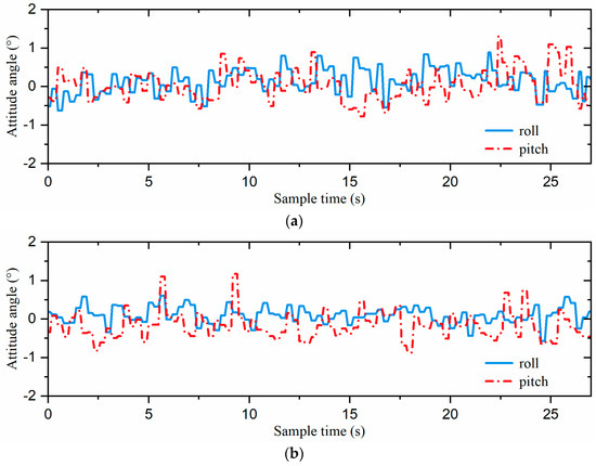 Attitude control experiments were carried out to assess the effectiveness of our proposed attitude control algorithm based on the single-neuron adaptive PID. We adopted the incremental PID attitude control method as a baseline and conducted two sets of attitude adjustment experiments. In the experiments, the hexapod robot was first initialized on a flat table surface to set its attitude. Then, it was placed on a slope, with its body parallel to the incline. After 2 s, both attitude control strategies were automatically activated to quickly adjust the hexapod robot’s attitude, ensuring that its body returned to a level position parallel to the table surface. It is worth mentioning that the attitude angles obtained by the sensor were processed by noise filtering.