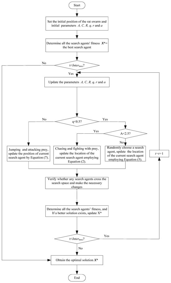 | Begin Step 1. Set the initial position of the rat swarm Step 2. Determine all the search agents’ fitness = the best search agent Step 3. while () do for each search agent Update , , , , r, and if 1 if 2 Update the location of the current search agent employing Equation (2) else if 2 Randomly choose a search agent Update the location of the current search agent employing Equation (5) end if 2 else if 1 Update the location of the current search agent employing Equation (7) end if 1 end for Verify whether any search agents cross the search space and make the necessary changes Determine all the search agents’ fitness If a better solution exists, update end while return End |