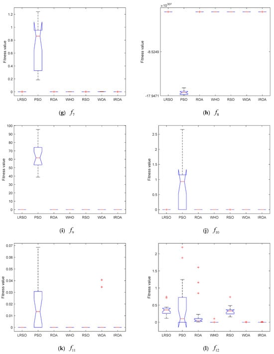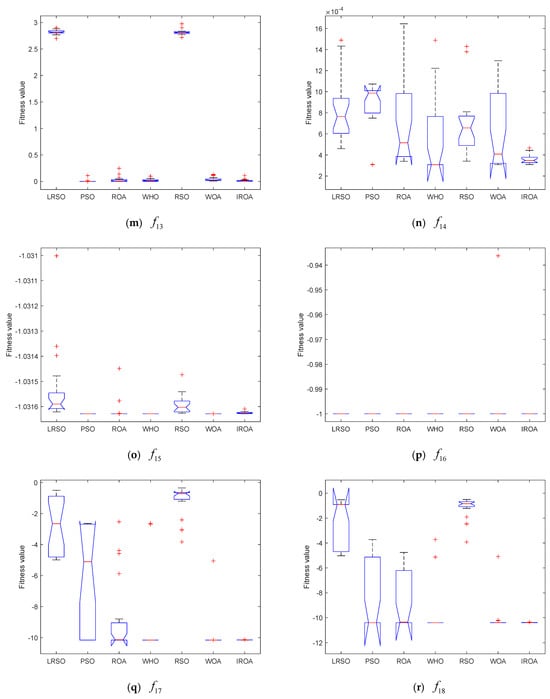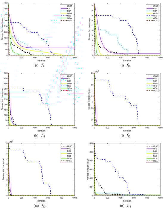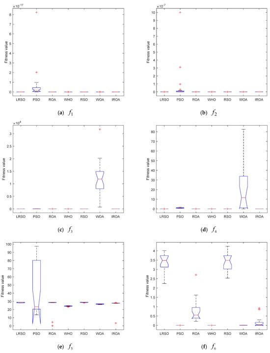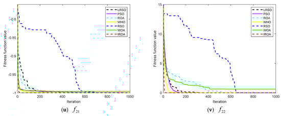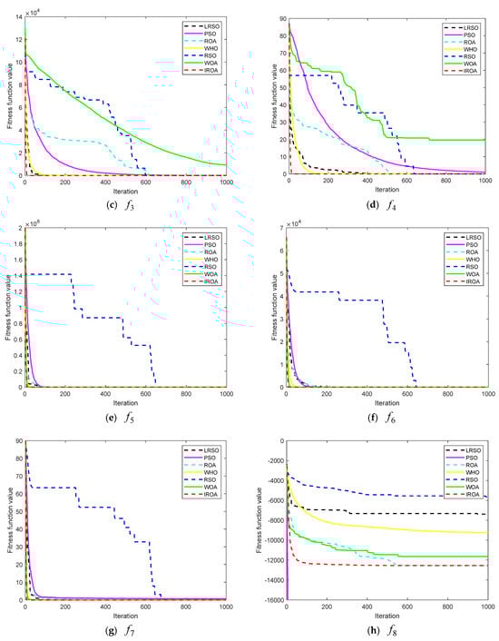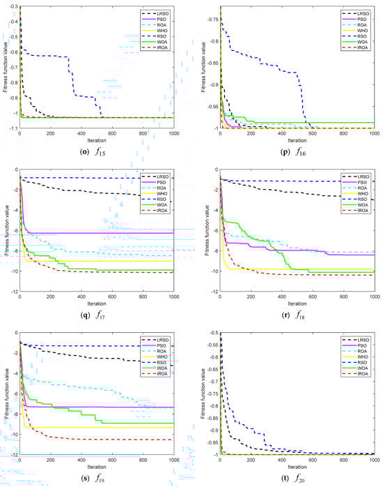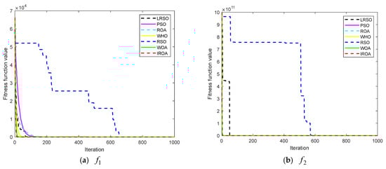 Assume that , , and express the population size, the dimension of the issue to be optimized, and the upper limit of iteration numbers in simulation, respectively. The time complexity of the algorithms mainly used for experiments in this section is summarized as follows. In [7], the time complexity of the RSO is . The time complexity of the PSO is [17]. After viewing the relevant literature [18,32] on the WOA algorithm, it is found that the time complexity of WOA is also . The overall computational complexity of WHO is [33]. The ROA primarily consists of four steps, namely initialization, chasing and fighting with prey (including the exploration phase), jumping in a semi-circular form around prey and attacking prey (including the exploitation phase), and halting judgment. A double loop ( and times) is included in the initialization, and the corresponding time complexity can be expressed as operations. Each operation in chasing and fighting with prey as well as jumping in a semi-circular form around prey and attacking prey contains a triple loop (, , and times), and the corresponding time complexity includes operations. Because the time complexity of the halting judgment is , the total time complexity of the ROA is . Since the time complexity of updating positions using the Levy flight strategy (there is a triple loop: , , and times) is , the time complexity of the LRSO in [24] and IROA is too. It should be noted that the mathematical models of the ROA and WOA are similar, so the computational complexity of the two algorithms is the same.