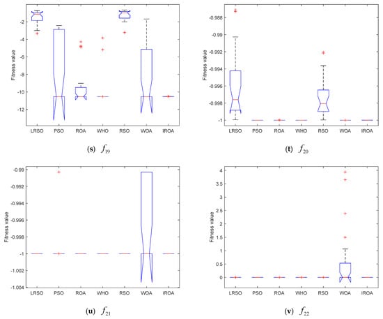 To illustrate the performance of the proposed ROA and the ROA with the Levy flight strategy, the simulation of the seven optimization algorithms is carried out in this section. These metaheuristic optimization algorithms include the rat swarm optimizer (RSO) [7], RSO with the Levy flight strategy (LRSO) [24], particle swarm optimization (PSO) [17], the wild horse optimizer (WHO) [19], the whale optimization algorithm (WOA) [18], the rat optimization algorithm (ROA), and the improved ROA with the Levy flight strategy (IROA). The parameter settings of all algorithms are provided in Table 2. The simulations of all the algorithms are performed in the Matlab R2022b version that is installed on Microsoft Windows 11 with a Core i7 processor with 2.60 GHz and 16 GB of memory. For the swarm intelligence algorithm involved in this paper, the corresponding population size, number of iterations, and number of independent runs are all set as 50, 1000, and 20, respectively. The optimum value, worst value, mean value, and standard deviation are expressed by Best, Worst, Mean, and Std.
