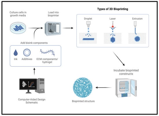 Three-dimensional bioprinting process and types of bioprinting. Created in BioRender.