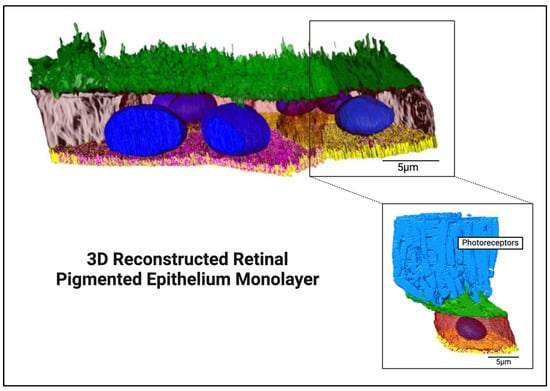 Keeling et al. [26] created reconstructed images of mice RPE 3D architecture (lateral view) showing apical microvilli (green) and nuclei (blue) with transparent cytoplasm allowing visualization of the convoluted basolateral Bruch’s membrane (yellow) with sub-RPE spaces (purple) and photoreceptors (light blue). Created in BioRender.