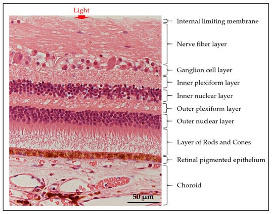 Neurosensory retina (NR) layer: Made of nine distinct layers, this layer contains photoreceptors, bipolar neurons, ganglion cells, and glial cells [26]. These structures coordinate to detect and convert light into neural signals, which are transmitted to the brain. The sheer complexity of these layers is illustrated by their distinct and vital functions (see Figure 3) [26]. Following the path of light, into the eye, these nine strata proceed as follows: inner limiting membrane, nerve fiber layer, ganglionic layer, inner plexiform layer, inner nuclear layer, outer plexiform layer, outer limiting layer, rod and cone layer (RCL), non-neural pigmented layers [26]. The RCL comprises 92 million highly light-sensitive rods (each with 600 to 1000 stacked flat membranous disks) and 4.6 million color-sensitive cones [26]. Importantly, these photoreceptors are non-motile primary cilia, and improper cilia orientation can have deleterious effects on vision [26].