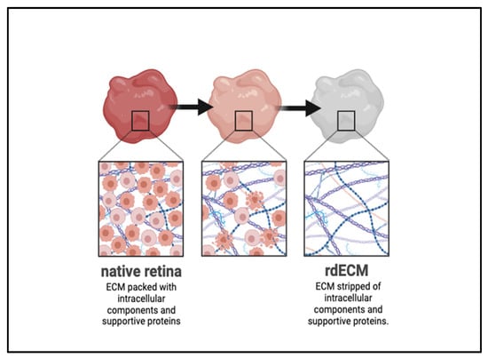 In cases where a hydrogel is not used, secondary cell types can be used as substrates to promote cell growth and ensure viability. To use inkjet 3DP to print cells of the adult rat retina, a bioink combining adult rat retinal ganglion cells (RGCs) and glia supported RGC viability via the growth-promoting properties of rat glial cells which were retained post-printing [43]. Decellularized ECM (dECM) is a common biomaterial used in place of hydrogels (see Figure 6). The dECM-based bioinks use ECM from an animal source (i.e., bovine, porcine) and solubilize dECM in acidic solution to create a printable gel material. This process supports cell viability by reducing immune rejection after printing to the native tissue given the similarity of the dECM to the natural ECM structure present in the human retina [44].