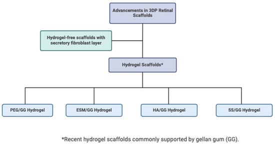 Flow chart summarizing recent advancements of scaffold engineering in 3D retinal bioprinting. Many scaffolds are made with gellan gum (GG) as a base for its improved strength during the printing process. Created in Biorender.