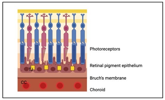 Retinal pigmented epithelial (RPE) layer: This layer, crucial for absorbing extraneous light and supporting photoreceptors, forms part of the blood–retina barrier, protecting photoreceptors from the vascular choroid. It regulates ion transport and vitamin A metabolism [6,7]. Importantly, the blood–retina barrier maintains retinal homeostasis protecting against pathogens and immune reactions [6,7]. These polygonal cells have complex intercellular junctions and extensive membrane invaginations (see Figure 2), reflecting their critical role in both metabolic support and maintaining the retina’s structural integrity [3,4,6,7]. The presence of melanin granules and various organelles involved in vitamin A processing, phagocytosis, and detoxification (e.g., peroxisomes) adds to the functional diversity of this layer. Additionally, this layer sits on Bruch’s membrane, a five-layered basement membrane and extracellular matrix between the retina and choroid (see Table 3 for acellular components found here). The RPE is also continuous with the choroido-capillary lamina of the choroid, which supplies the avascular RPE with oxygen and nutrients [4,5].