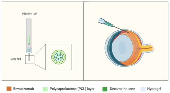- Won, J.Y.; Kim, J.; Gao, G.; Kim, J.; Jang, J.; Park, Y.-H.; Cho, D.-W. 3D Printing of Drug-Loaded Multi-Shell Rods for Local Delivery of Bevacizumab and Dexamethasone: A Synergetic Therapy for Retinal Vascular Diseases. Acta Biomater. 2020, 116, 174–185. [Google Scholar] [CrossRef]