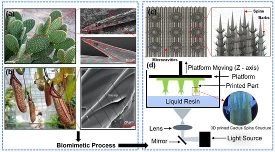 Biomimetic fog water collection system: (a) natural cactus structure with SEM image of conical spine and conical barb, (b) pitcher plants (Nepenthes Alata) with SEM image of microcavity within microchannel, (c) CAD model of bio-inspired water collection system with spine, barb, and microchannel structure; (d) photopolymerization 3D printing process with SEM image of 3D-printed object.
