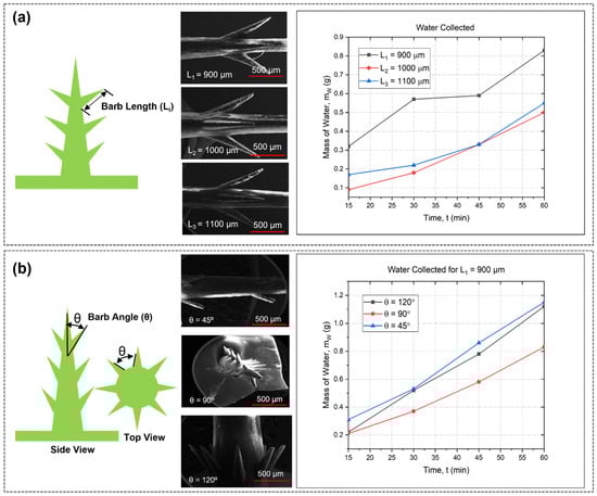 Water collection and transportation of 3D-printed cactus structure: (a) microscopic image of different barb lengths 900 µm, 1000 µm, and 1100 µm with water collection amount over time; (b) microscopic image of different barb angle 45°, 90°, and 120° with amount of collected water for barb length 900 µm over 60 min period.