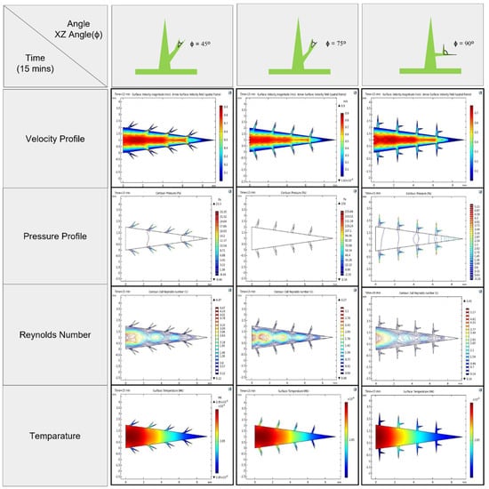 Bionic simulation of 3D−printed spine structures with the effect of four essential parameters (velocity, pressure, Reynolds number and temperature) at different barb angles (XZ plane) with fifteen−minute time interval.