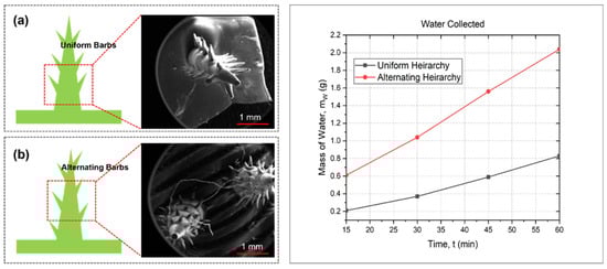 Comparison of barb arrangement for water condensation of 3D-printed artificial cactus spine structure: (a) microscopic view of uniform barbs; (b) microscopic view of alternating barbs.