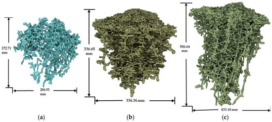 Visualization of ant nest casting: (a) Cast 0P1; (b) Cast 062; and (c) Cast 107.