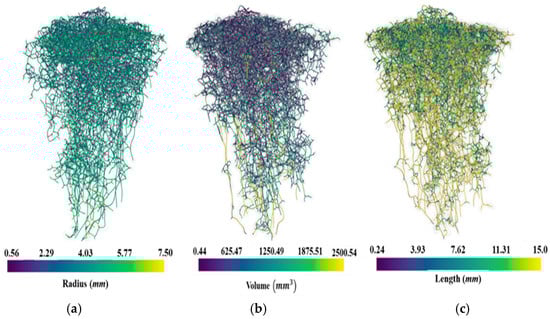 Skeletonized visualization of Cast 107: (a) radius, (b) volume, and (c) length.