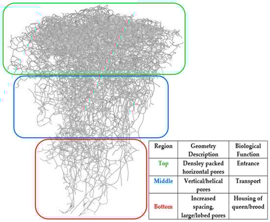 This research presents an investigation of the structural designs and mechanisms exhibited in the pore geometries of fire ant nest cavities that allow for increased resistance to collapse through finite element analyses of models of reconstructed real fire ant nest pore geometries. To accurately reconstruct a model of the geometry from fire ant nest cavities, aluminum castings of fire ant nests were imaged using X-ray computed tomography and converted to solid models. To further explore the impact of regional pore geometry variation on the loading response, RVE analyses were completed on nine RVEs (three for each defined region through the depth).