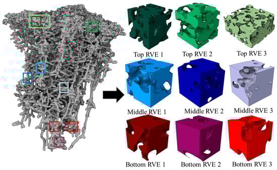 A Boolean subtraction was performed to create a cavity shaped like the pore geometry from the region it was taken. It was decided that the RVEs would be rectangular prism-shaped cubes due to the requirements of a micromechanics plugin used for the homogenization of elastic properties, which are discussed later in this section. To assess the validity of the sizing selection of the RVEs, it must be proven that the behavior exhibited from that RVE is indicative of the response when analyzing the section as a whole. In order to verify our sizing assumptions, multiple additional RVEs were taken from different locations in each section in order to verify that the response was similar to that of the simulations presented. In addition, an RVE with a double aspect ratio was also taken in the top section to further investigate the effect of the RVEs’ size on test results. This proved to be computationally demanding and, therefore, was not repeated for the other sections. In addition to verifying the RVEs’ size as equivalent to the aggregate response, this study was also used to investigate the variations of porous geometry and density in the three defined sections. The RVEs and the locations from which they were derived are shown in Figure 4.