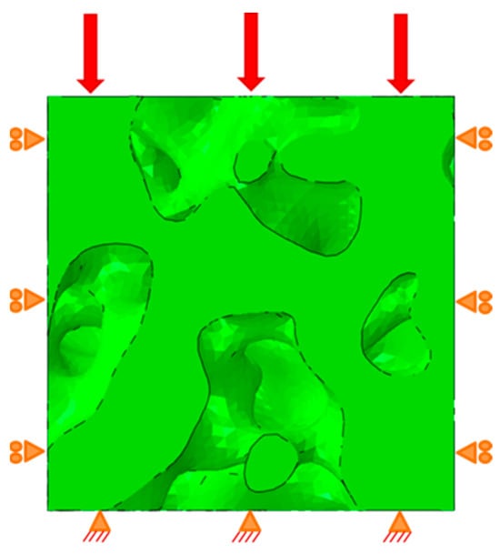 The representative volume elements that were constructed and sized for their respective sections were prescribed a compressive loading as to assess their response to mechanical loading and to understand the role of the geometries/orientations of the cavities on collapse behavior. All nine RVEs were subjected to identical confined compression boundary conditions on lateral and bottom faces and uniformly enforced displacement loading at the top face. The applied displacement on the top face corresponded to a 20% global strain. This was chosen as it is representative of large deformations to ensure collapse while also being low enough to prevent the onset of excessive element distortion issues. The sides of the RVEs were laterally constrained on the faces, such that the x and y displacements were set to zero on their respective faces. The bottoms of the RVEs were fixed. This confined compression loading of the RVE models is illustrated in Figure 5.