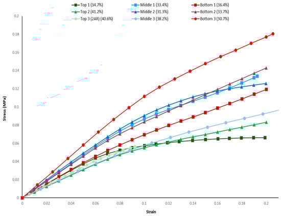 The stress–strain response of the RVEs are color coded for each group based on location: the RVE taken from the top in green, from the middle in blue, and from the bottom in red. The graphs show that the stress–strain behavior varies between the RVEs taken from the between the various regions. The stress–strain response of RVEs taken from the same regions exhibit small variations due to the randomness of the pore cavity structures in the RVEs. Despite these variations, the differences between RVEs taken from different regions are distinct and noticeable.