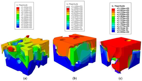 To further illustrate these observations, contour plots of the displacement magnitude and von Mises stress for one RVE from each region analyzed in the confined compression are presented in Figure 7 and Figure 8. The contour plots of the displacement magnitude and von Mises stress for the remaining six RVEs can be found in previous work [43]. These displacement and stress contours correspond to a global compression strain of 20%.