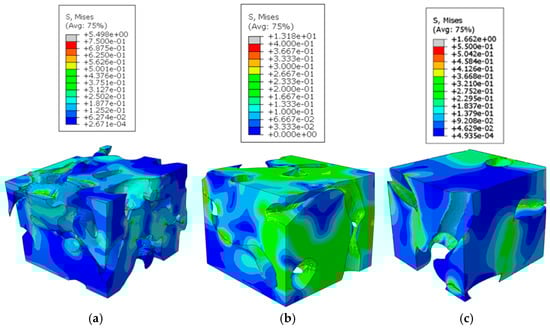Von Mises (MPa) contours of RVE analysis indicating non-homogenous stress distributions around cavities that lead to local collapse: (a) top; (b) middle; and (c) bottom.