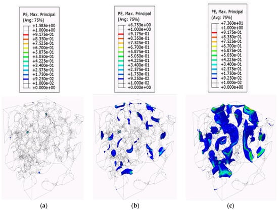 Plastic strain growth of the middle RVEs: (a) 0.066; (b) 0.13; and (c) 0.2.