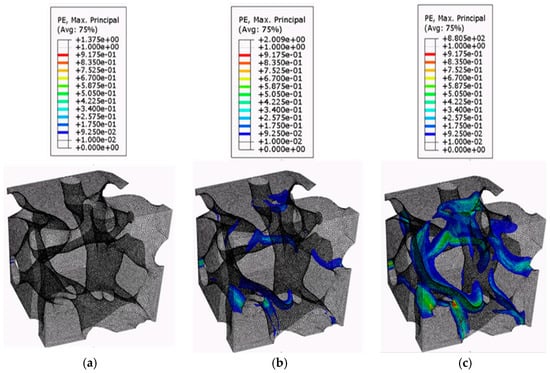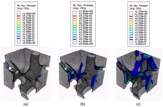 Plastic strain growth of the top RVEs: (a) 0.066; (b) 0.13; and (c) 0.2.