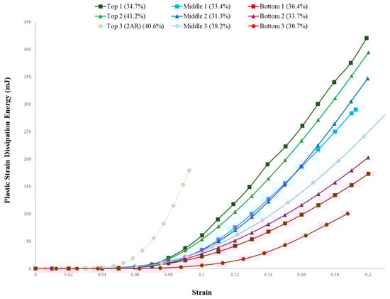 To further support these claims made regarding the plastic strains, contour plots of the yield stress were obtained and agreed with previously stated conclusions. These results can be found in previous work [43]. These plots further correspond with the yielded areas seen in the plastic strain regions. Additionally, the global plastic strain energy dissipation is plotted against the global strain illustrated in Figure 12.