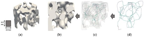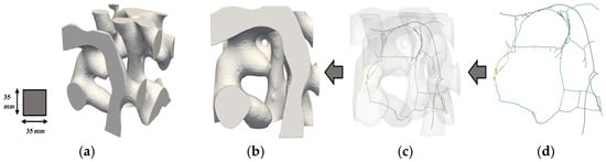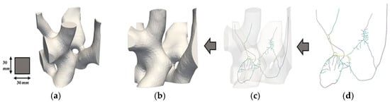 Skeletonization of Top RVE 1’s porous network: (a) isometric view; (b) original volume (c) superimposed volume; and (d) skeleton volume.