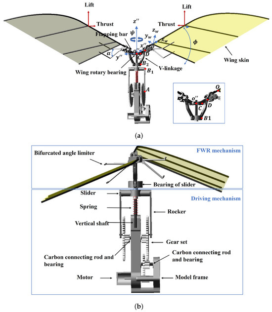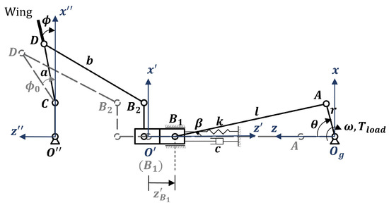 The mechanical system of the FWR model, depicted in Figure 1 and further detailed in Figure 3, illustrates the main components of the flapping and driving mechanisms along with their kinematics in detailed coordinate systems. A slider, , moves linearly along the z-axis when driven by a motor through the gears, a crank arm, , at an angular speed, (), and a linkage, . A spring with stiffness k is connected between the slider and a fixed point. The bearing of the slider moves with the slider, linking to the flapping bar at point D via the linkage bar using pin joints. The length of the bar and the distance between and the central axis are equal. The grey dotted line and corresponding joint points depict the maximum displacement of the flapping bar motion constrained by the sliders.
