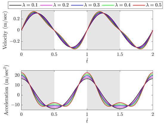 The length ratio () significantly impacts the kinematics of the sliding motion. The sliding velocity and acceleration are obtained for different values with reference to the coordinates, and the results are shown in Figure 4, where the grey and white areas represent the downstroke and upstroke of the flapping motion, respectively. Given a small angular change near the starting position at , the slide velocity is =, whereas near the end of the wing downstroke at =, the slide velocity is =. Obviously, for any non-zero , and the slide maximum velocity occurs before one quarter and after three quarters of a period for a whole cycle. A larger results in a greater time difference between the positive and negative peaks of velocity in a flapping cycle, leading to increased acceleration at the beginning and end of the cycle. It is clearly shown in Figure 4 that when is greater than 0.3, multiple acceleration peaks occur near the midpoint of the cycle as the wing transitions from a downstroke to an upstroke. When is small enough to be ignored, the kinematics of the slide and flapping motions can be simplified to simple harmonic motions.