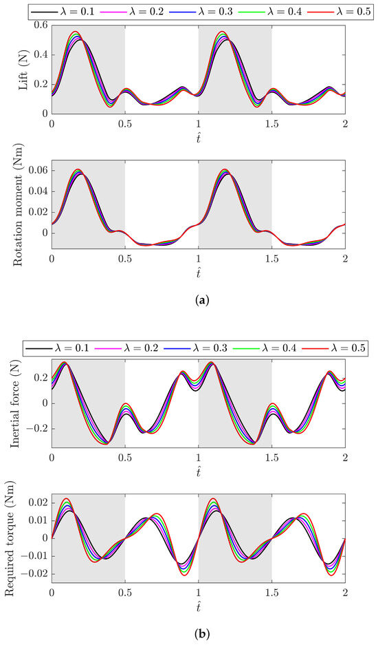 The length ratio further affects the production of aerodynamic forces and the required torque for driving the system instantaneously. The results are obtained and presented in Figure 5 for driving the baseline FWR model using different values with reference to the coordinates. Figure 5a shows the results for the lift and rotation moments. A larger results in both a higher peak lift and rotation moment during the downstroke. These also occur earlier due to the higher initial acceleration and the earlier velocity peak of the flapping motion. Figure 5b shows the results for the inertial force and required torque. It is obvious that the peak value of the wing inertia force increases with an increasing value of , which is consistent with the sliding acceleration variation. Similarly, the variation in the required torque is influenced by both aerodynamic and inertial forces, increasing dramatically with increasing values of .