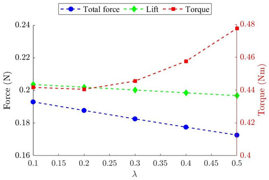 Variation in the average lift, total force, and input torque of the baseline FWR model with different values.