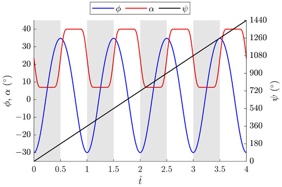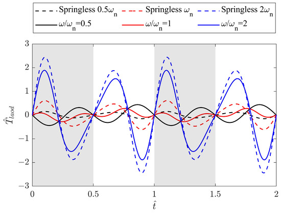 - Case without aerodynamic forcesThe dimensionless required torque of the pure mechanism with a fixed spring stiffness of N/mm was investigated for various values, and the results for three specific cases are shown in Figure 9 against the dimensionless time . For comparison, the baseline model without a spring operates at the corresponding frequencies of the spring model in the following cases: , , and 2. The baseline model results are depicted in the figure using dashed lines. Clearly, at resonance, i.e., = 1, is minimised at . As a result, the peak value of is reduced by 54% and the power saving is compared to the baseline model at the same frequency . When the frequency exceeds , the required torque increases with the frequency. At , reduces to 23%, keeping the torque smaller than the baseline model.