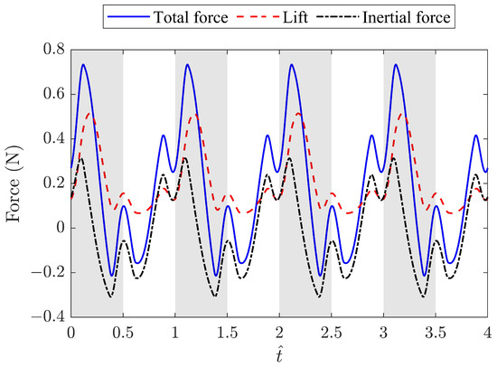Total force, inertial force, and lift of the baseline FWR model with at a flapping frequency of 8 Hz, with reference to the coordinates.