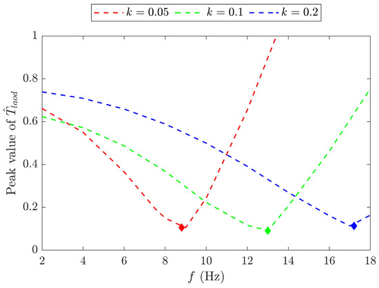 Figure 10. The peak value of versus the flapping frequency f with different spring stiffnesses k. - Case with aerodynamic forcesThe required torque was then investigated for three different springs together with the springless baseline model under the condition of aerodynamic force generation. The results are presented in Figure 11 at a flapping frequency of 8 Hz. The aerodynamic force produced by the spring models remains the same as that of the baseline model. The model with a 0.05 N/mm spring has a resonance frequency that is close to 8 Hz, resulting in the smallest required torque compared to other models, while producing the same aerodynamic force. Clearly, the spring stretches before the mid-downstroke, providing an elastic force that aids wing flapping and results in negative torque. After the second half of the downstroke, the spring compresses, leading to an increase in the positive torque. The same pattern reverses for the upstroke.