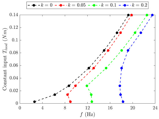Input torque for the FWR model with different spring stiffnesses k versus flapping frequencies f.