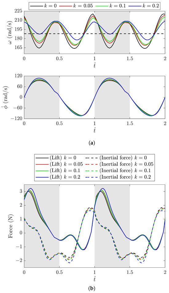 (a) Variation in the crank angular speed and the wing flapping angular velocity with different spring stiffnesses k versus ; (b) the lift and inertial force versus ( with reference to the coordinates; and forces with reference to the coordinates).