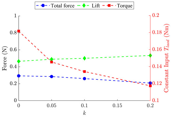 Time-averaged total force, lift, and input torque versus spring stiffness k.