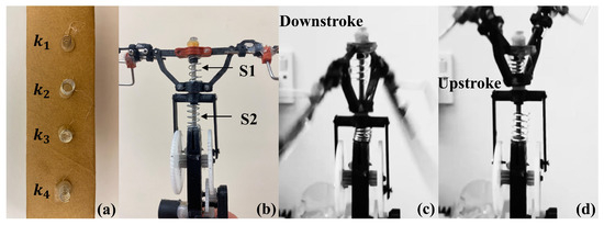 Based on the analytical study, a range of spring stiffnesses ( = 0.036, = 0.055, = 0.11, and = 0.22N/mm) were selected for the experiment, as shown in Figure 16. The spring was split into two, above and below the slider. When the slider was in the middle position, with , both springs were in their neutral position with their original lengths. When the slider moved to the second half of the downstroke (including the wing downstroke), the lower spring compressed. The spring returned to neutral after the first half of the upstroke and then compressed in the second half. The spring arrangement represents the analytical model. In addition, two different mechanisms were tested to reflect the analytical cases: one is a pure mechanism without aerodynamic force generation, while the other includes it.