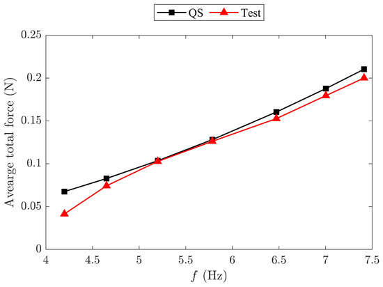 For this test, the wings were covered with a membrane skin to generate aerodynamic forces. The measured instantaneous total force of the FWR model included both aerodynamic and inertial forces. The average total force measured for the springless baseline model over a flapping cycle was compared to the average aerodynamic lift predicted by the QS method across different flapping frequencies, as shown in Figure 19. Since the average inertial force over a flapping cycle equals zero, the measured total force closely matched the analytical average aerodynamic lift result.