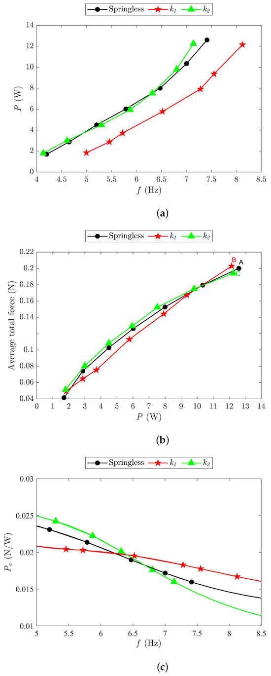 In summary, in Section 2, we presented parameter studies of the FWR mechanical system, estimating the system’s resonance frequency and determining the optimal spring stiffness to enhance the design. Subsequent experiments were conducted on the FWR test model with to validate these analytical results through force and power measurements.
